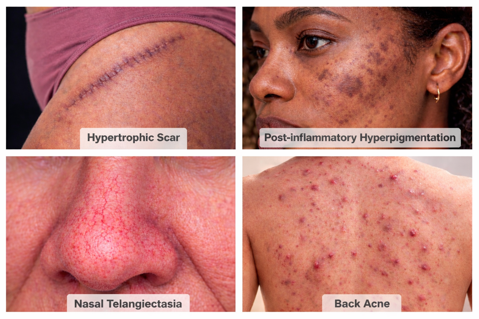 Targeted laser treatments for pigment disorders, scarring, vascular conditions, and follicular-related skin concerns, delivered using protocol-driven clinical standards.
